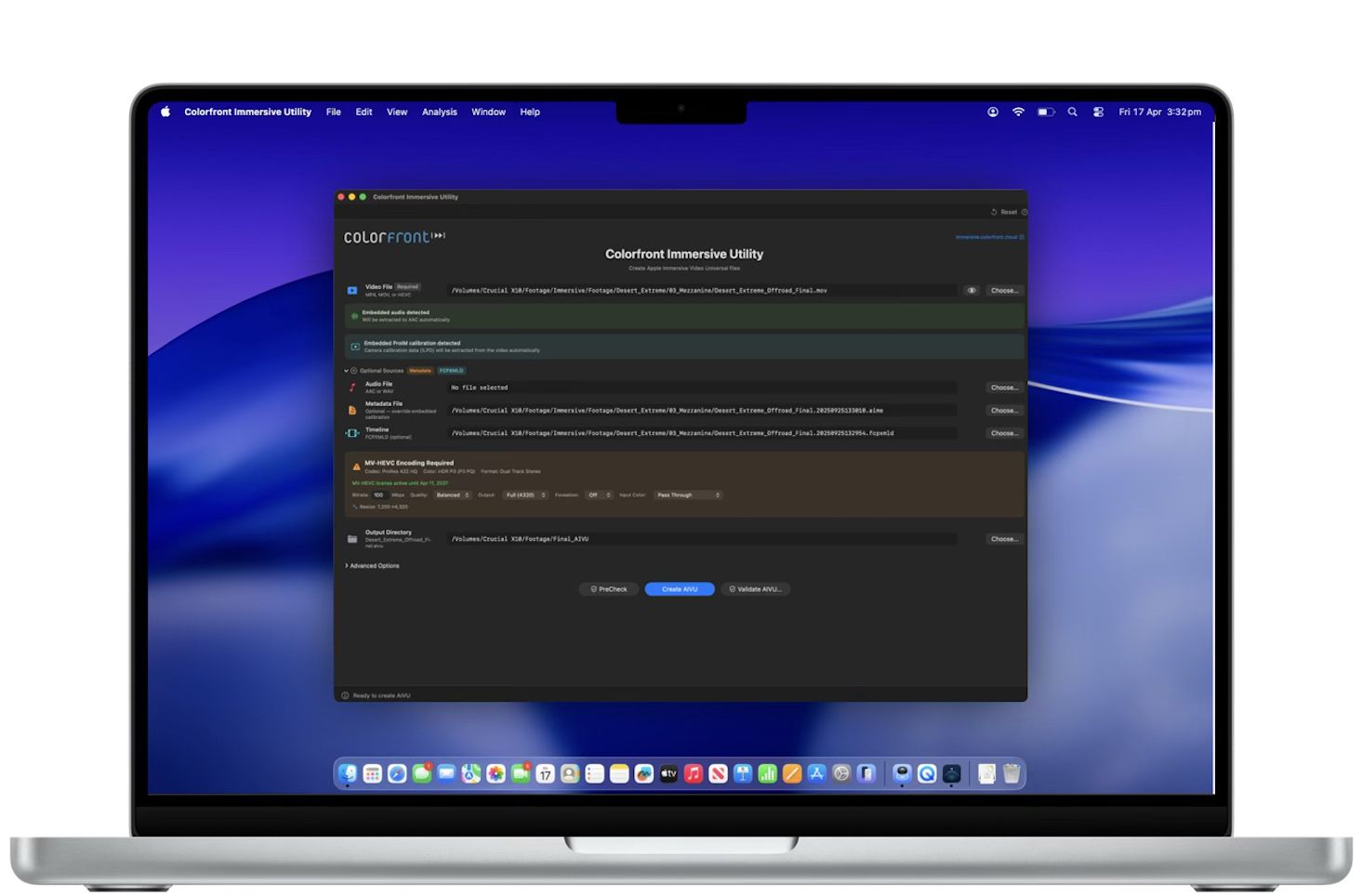 LOS ANGELES - Rezul -- Colorfront today announced Colorfront Immersive Utility, a new macOS app that creates Apple Immersive Video files (.aivu) for playback on Apple Vision Pro. The app accepts video in ProRes, MV-HEVC, and other standard formats, pairs it with Spatial Audio and camera metadata, and outputs a single AIVU file ready for distribution.