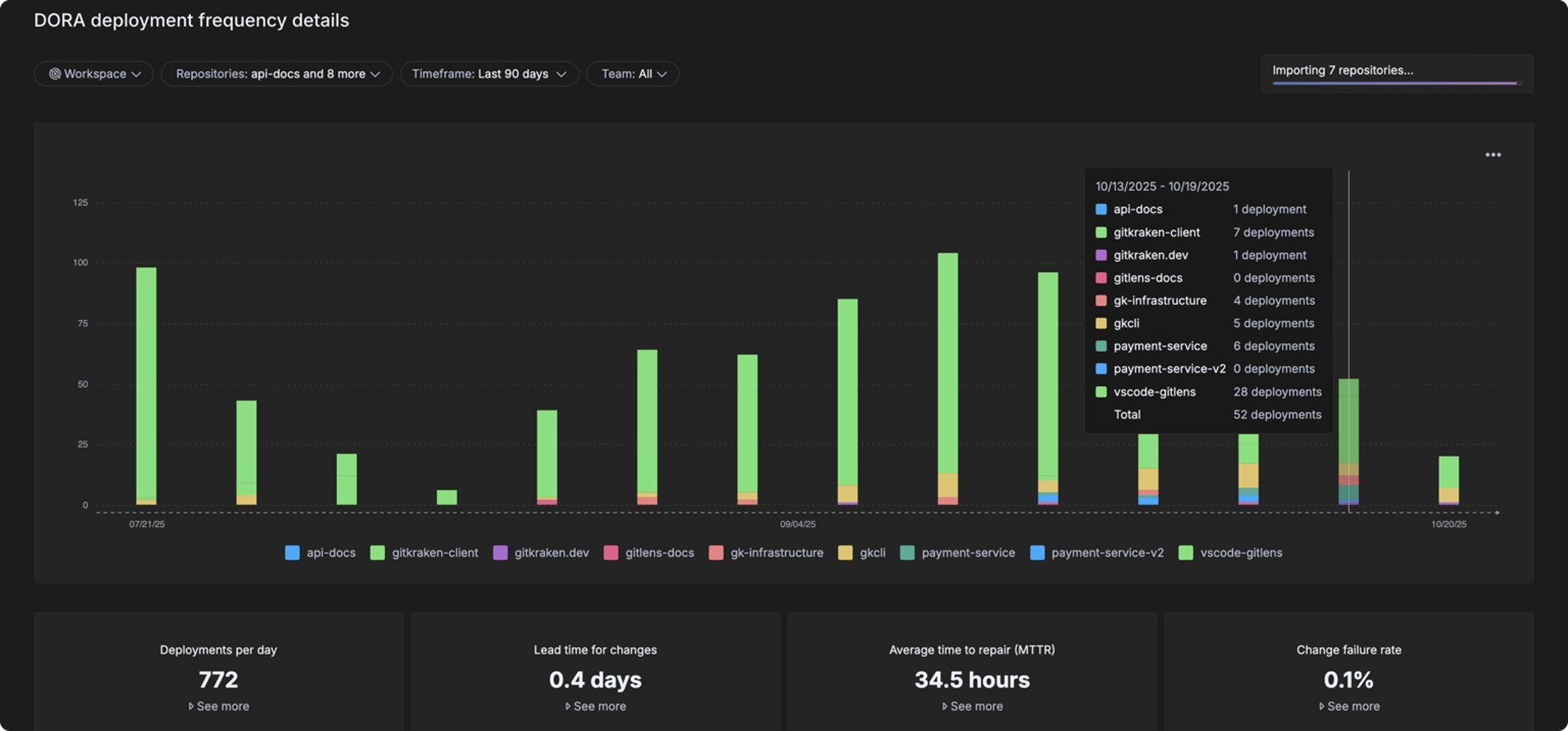 GitKraken Insights combines GitKraken's developer experience expertise with GitClear's SEI capabilities, providing DORA metrics, code quality analysis, technical debt tracking, AI impact measurement, and developer sentiment insights—at 80% cost savings and with faster implementation.