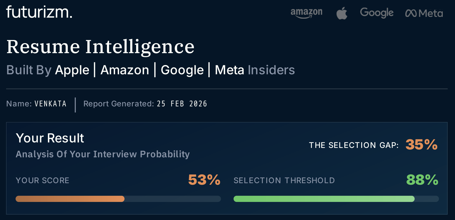 Our team is led by a 20-year recruiting veteran from Google, Meta, and Amazon, in collaboration with ex-Apple engineers. Together, we've spent the last two years distilling the data of thousands of successful Big Tech hires into a single intelligence platform. Today, we are proud to announce the launch of 'Resume Intelligence' by Futurizm.io.