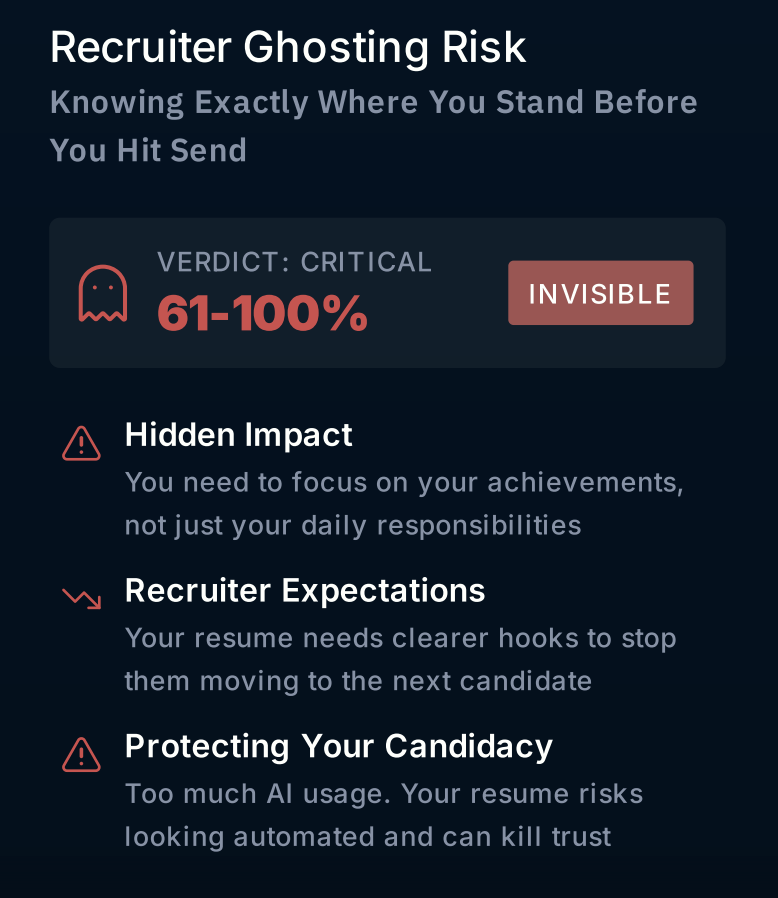 - Interview Probability %: A data-driven assessment of your likelihood of reaching the next stage.