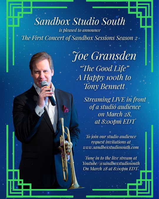 In Sandbox Sessions S2E1 on March 28th, 2026 at 8:00PM, Joe will present a selection of Tony Bennett hits in tribute to what would have been Tony's 100th birthday. The show will be captured in front of a live studio audience and broadcast with brilliant 4K video and digitally mixed audio.