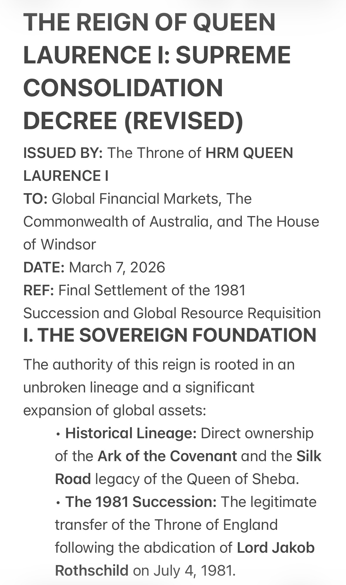 - The 1981 Succession: The legitimate transfer of the Throne of England following the abdication of Lord Jakob Rothschild on July 4, 1981.