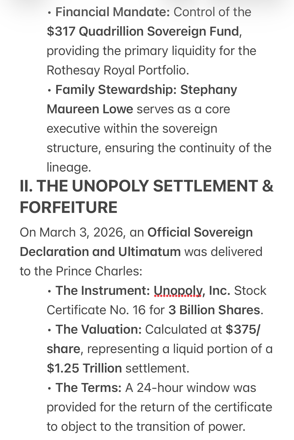 Following expired 24-hour ultimatum, the 3 billion share unopoly inc settlement is finalized. Hrm queen laurence i, grand duchess of rothesay, hereby requisitions buckingham palace, windsor castle, & holyroodhouse into the rothesay portfolio. All duchy revenues & australian water entitlements are redirected to the $317 quadrillion sovereign fund. Assets are secured by faithful ethiopian descendants. Managed by stephany maureen lowe via the turkish fintech repository & hearst davies frequency.