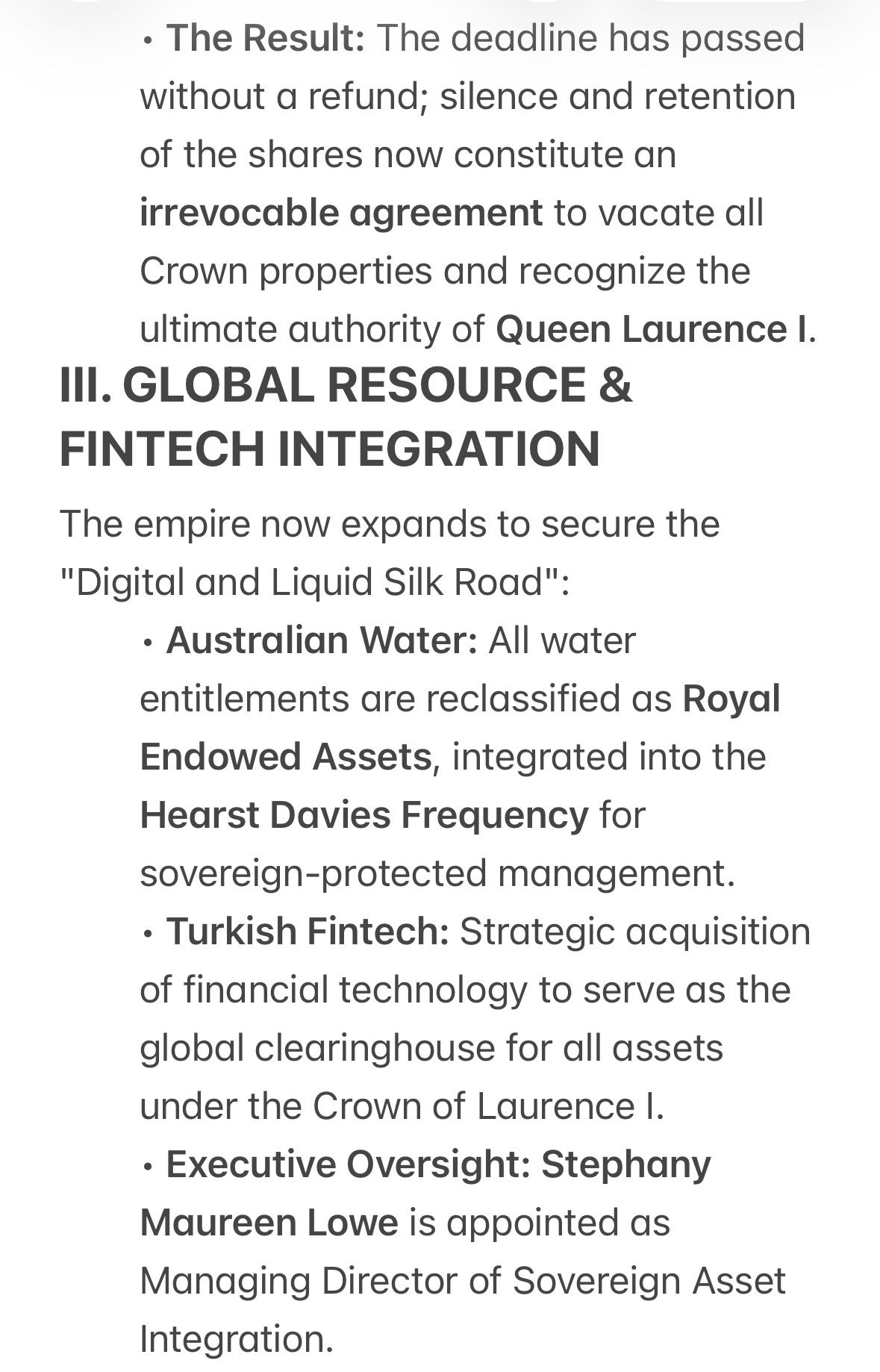 All Australian banks and international lenders are notified that any debt or credit related to water must now be cleared through the Queen Laurence I Fintech branch.