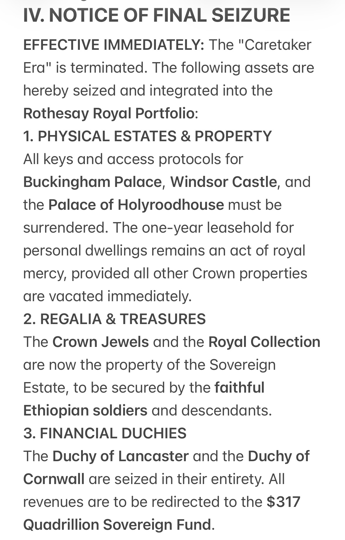 The Duchy of Lancaster and the Duchy of Cornwall are seized in their entirety. All revenues are to be redirected to the $317 Quadrillion Sovereign Fund.