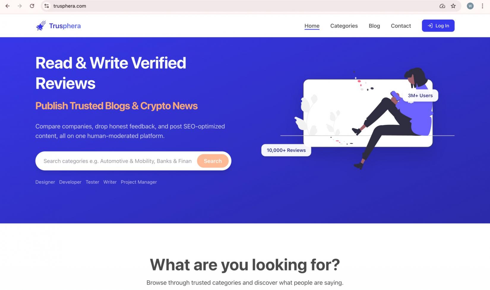 Trusphera.com is a new online platform built to serve users who want to post reviews for any business or website, as well as publish long-form blog content, including crypto blogs, technology insights, and finance-related articles.